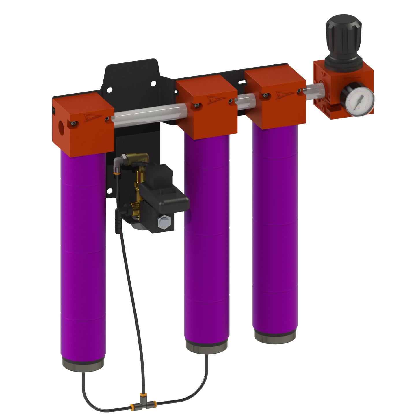 15 SCFM, Water Separator, Oil Coalescing filter, Activated Carbon filter, Membrane Air Dryer with regulator and electronic drain valve.